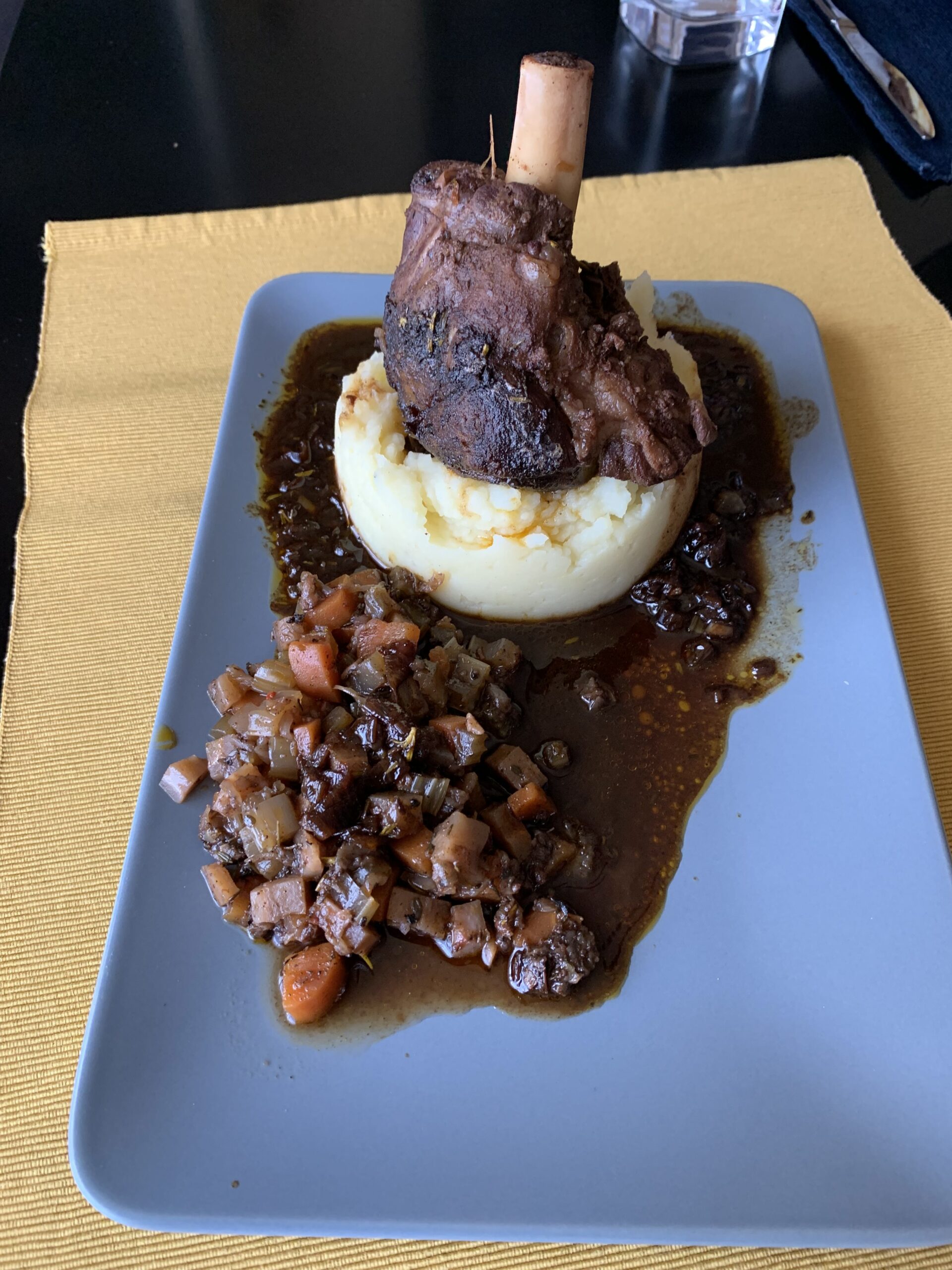 1. A tányérra halmozzuk a burgonyapürét, ráhelyezzük a csülköt.